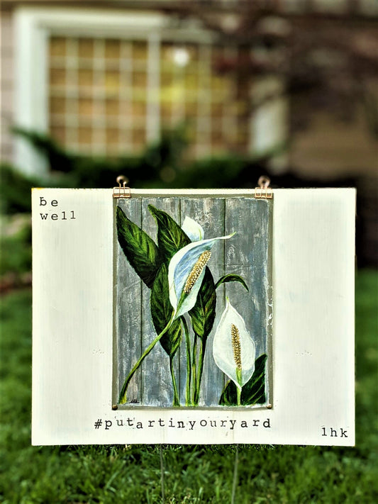 “I painted ‘yard art’ during the COVID-19 pandemic quarantine, placing new paintings outside periodically, hoping to bring a smile or chuckle or moment of peace to walkers-by. These paintings are available for sale now. A percentage of each sale from this collection will be donated to COVID-19 aid.”