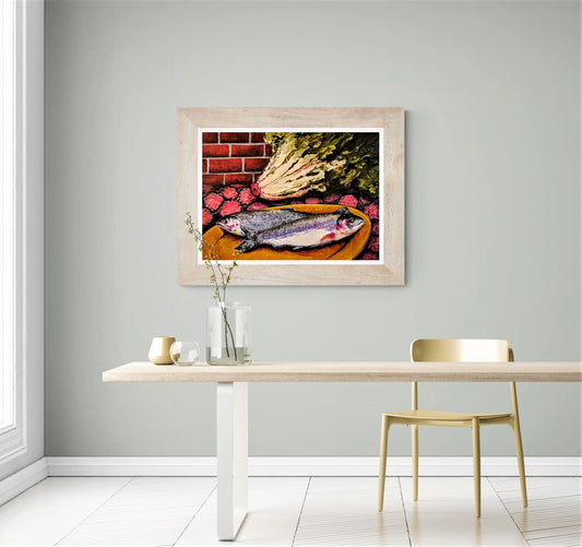 Story of Reds & Greens: Still Life with Romaine, Blossoms & Fish on a Platter