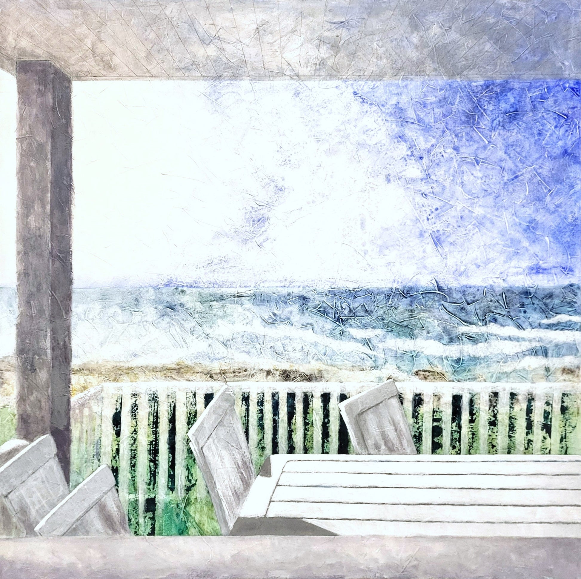 watercolor, acrylic, Flashe, Posca, medical exam paper, napkin, sand resin & colored pencil on canvas, 36" x 36"