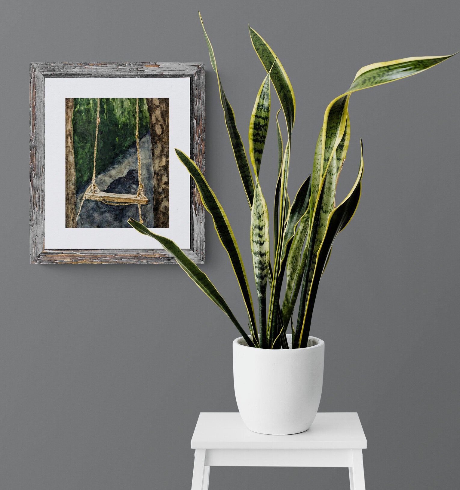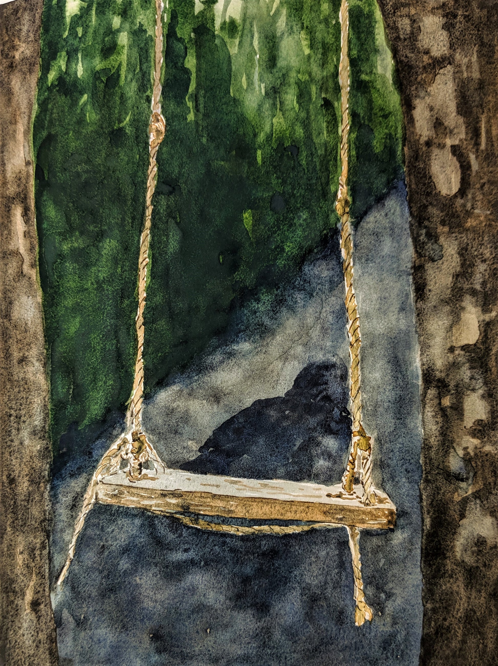 Empty rope swing hovers over shadow of...?