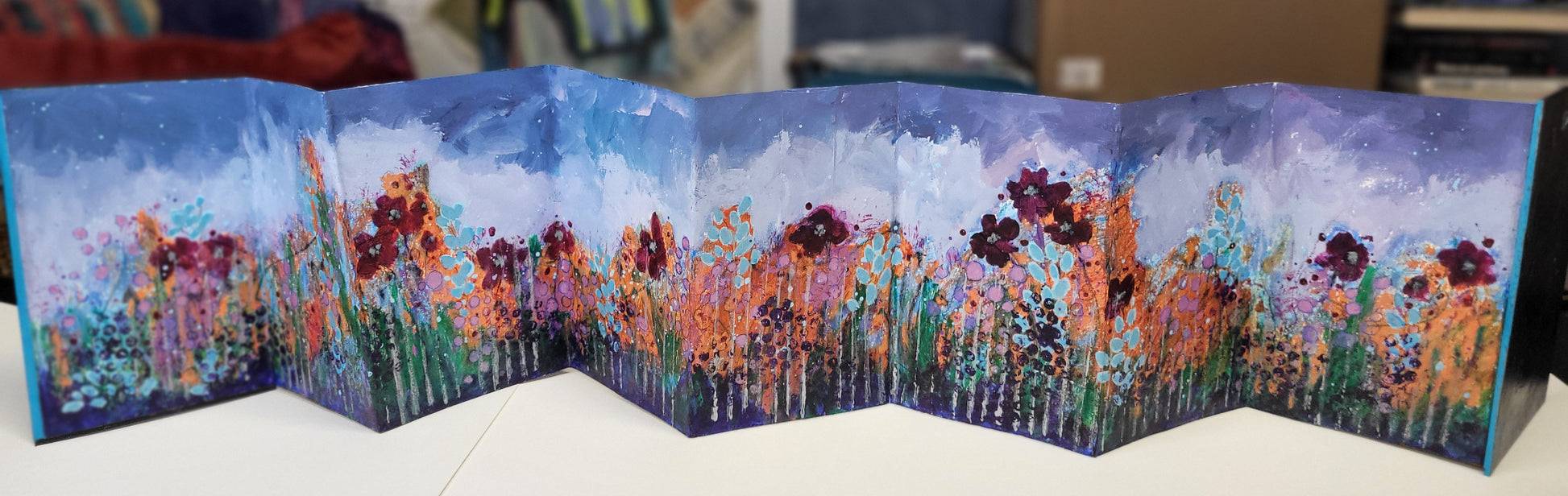 Handmade concertina book: acrylic, ink, china marker & colored pencil on paper, 7.5" x 5“, can open to approximately 33"