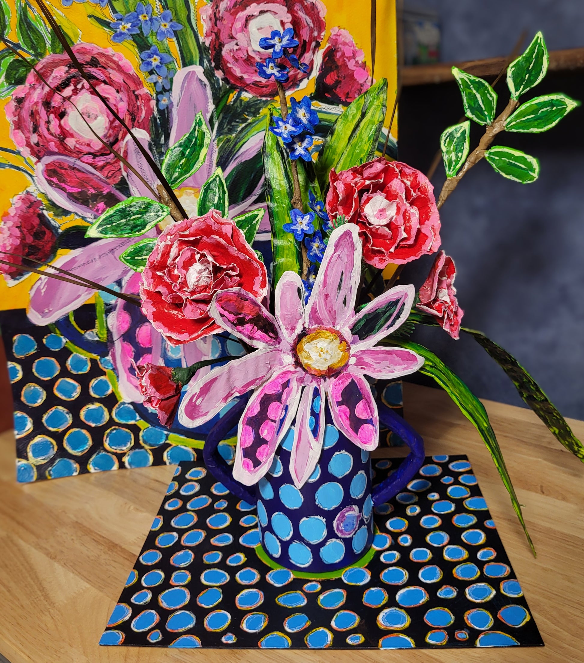 acrylic, grease pencil & collage on papers pop off the wall to become this painting's 3D version in papier-mâché, made with a long list of recycled & art materials