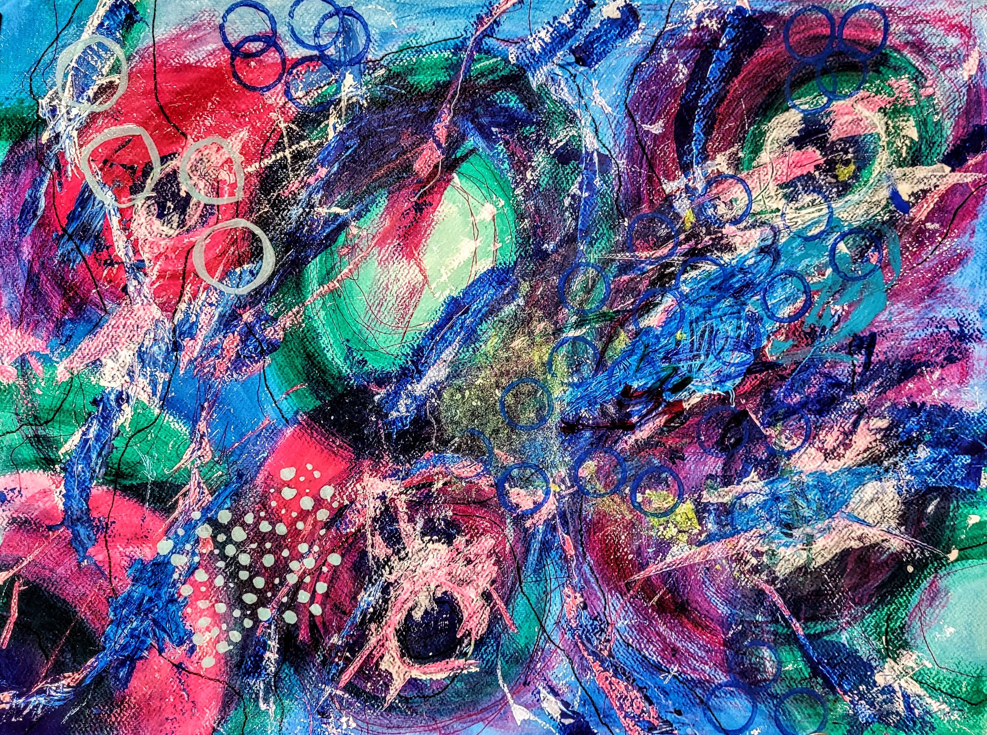 acrylic, watercolor, ink, graphite & handmade collage on paper, 18" x 24"