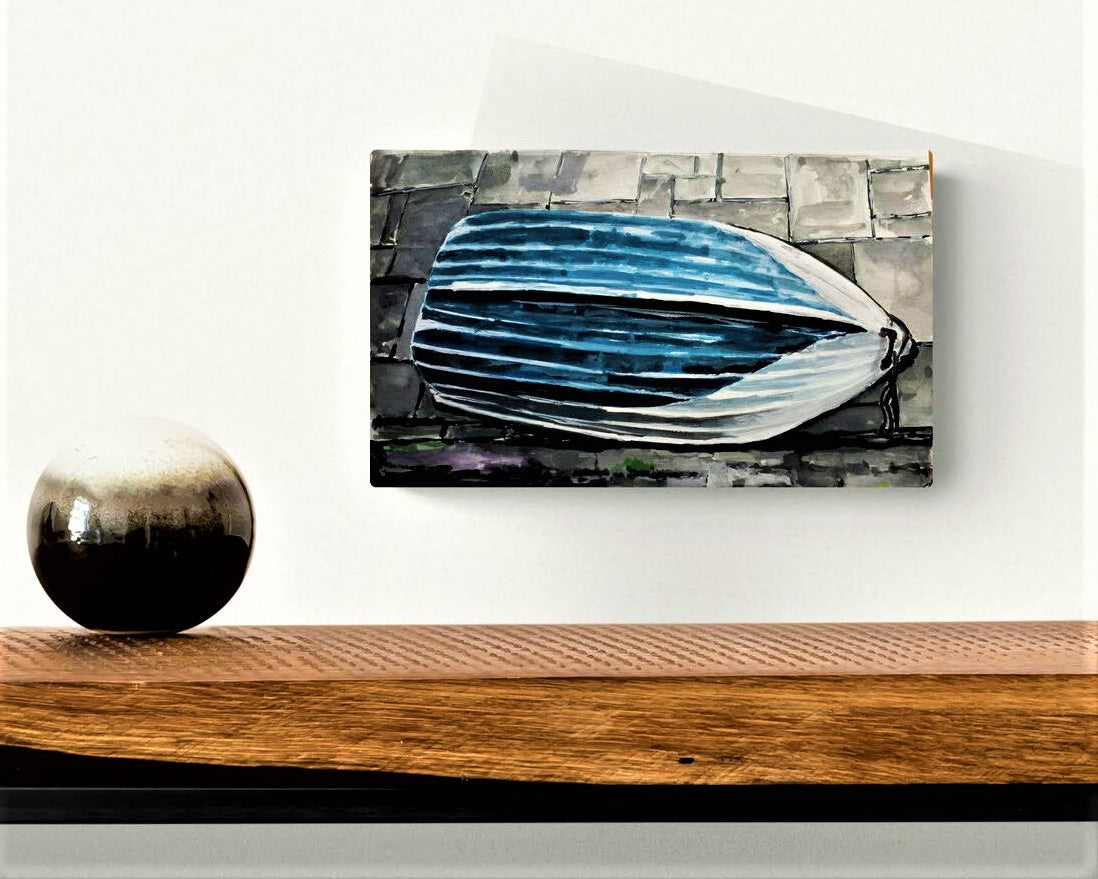 Lovely old rowboat, resting upside down on a cool stone slab expanse in Porto, Portugal.