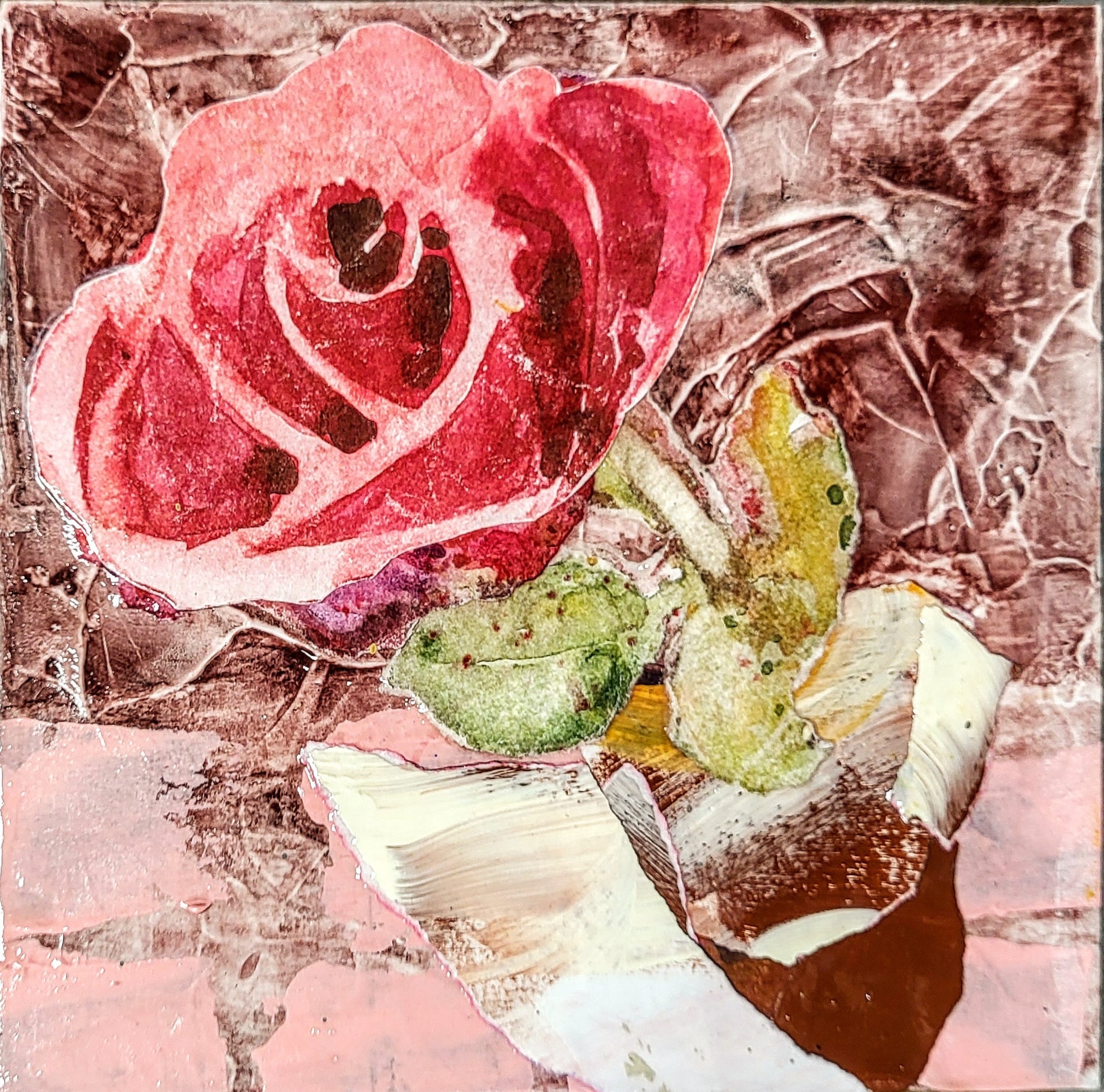watercolor & acrylic paint, hand-painted collage papers, ink & graphite on wood, 6" x 6"